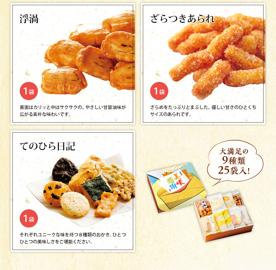 もち吉職人こだわりの詰め合わせ。 9種25袋を詰合せた老舗お味見セットをお楽しみください。 ※お届けに一週間~10日前後、お日にちをいただくことがございます。
