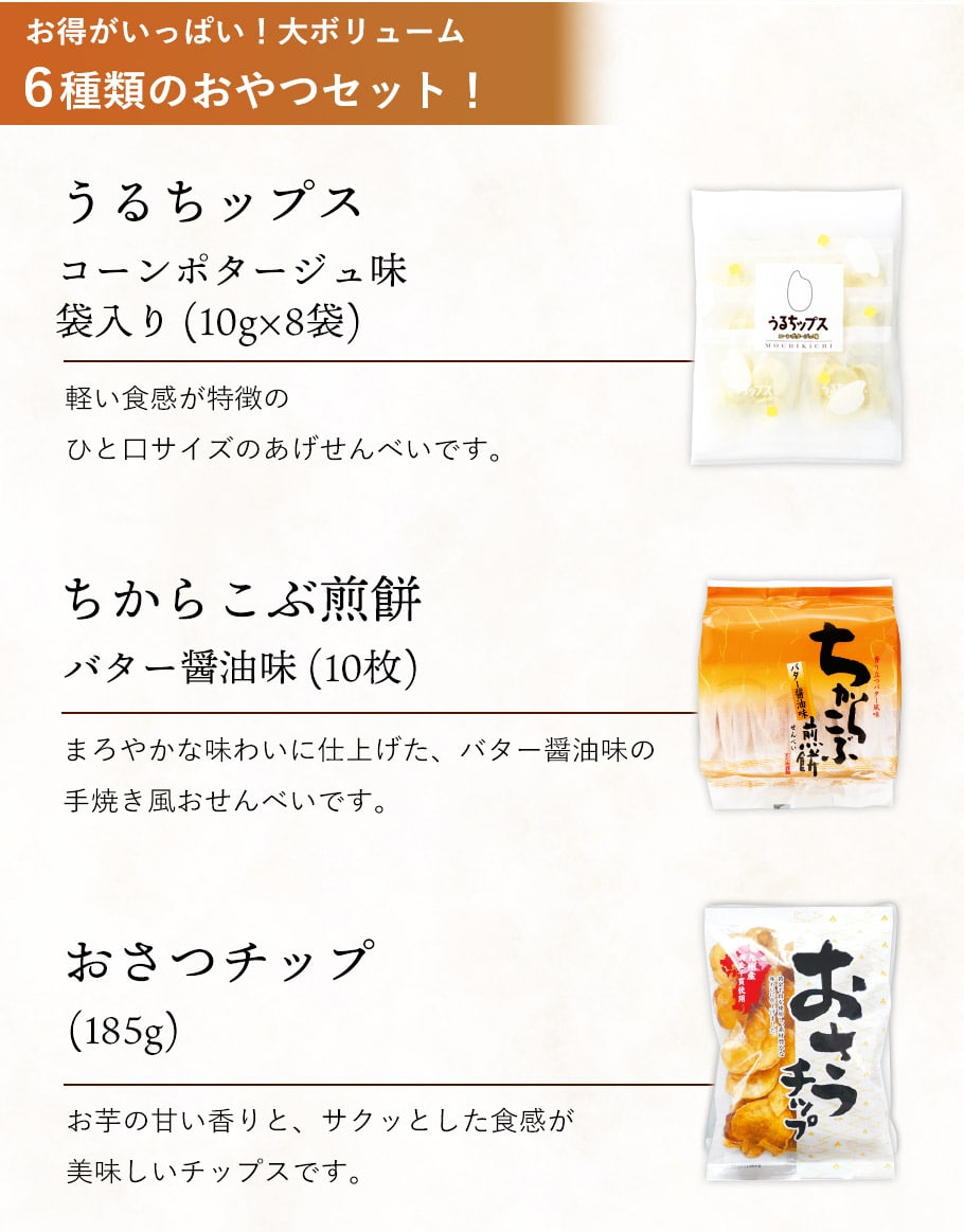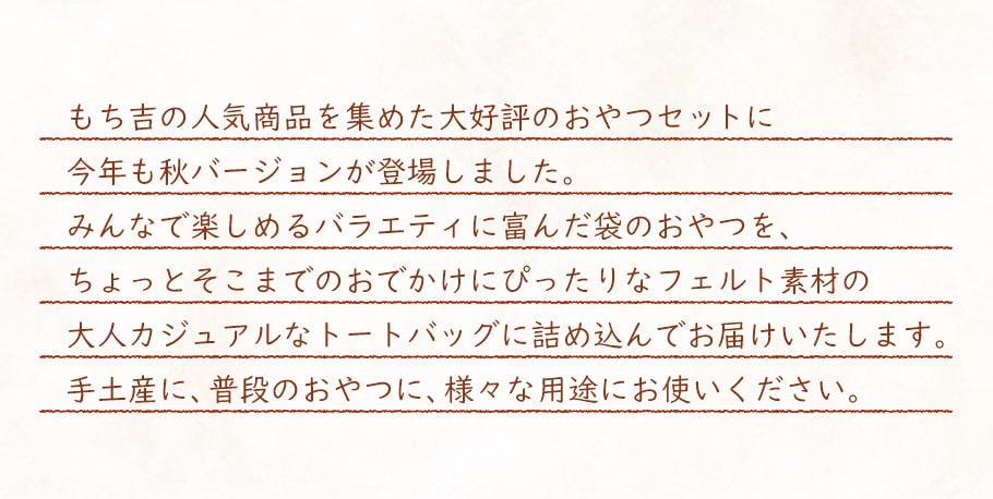 自分用に購入して良かったので別居の母のプレゼント用に購入しました。商品到着日の夜に会う約束をしていたので手渡ししました。先ほど母から電話があり「ふくよか餅詰合せが7種類が2本ずつ入っていたのでお父さんと1本ずつ食べた」「他のお菓子もたくさん入っているからお父さんと半分ずつ食べる」「素敵なバッグを気に入った」と大喜びしていました。渡して良かったです。秋のおやつセット2020を作っていただきありがとうございました。