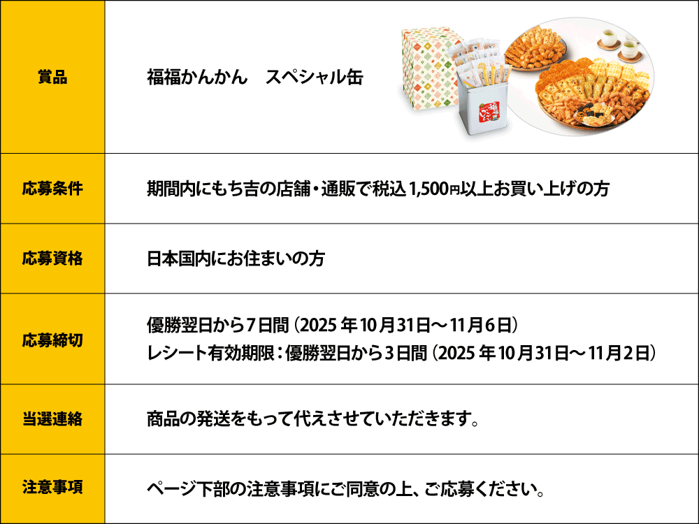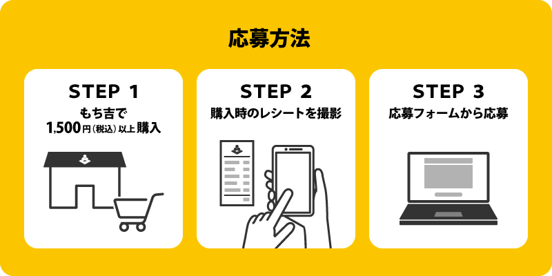 応募方法:もち吉(店舗・通販・ネット本店)で合計1,500円(税込)以上お買い上げのレシート(または請求書など購入内容が記載されているもの)の画像を応募フォームにアップロードし、必要事項を記載してご応募ください
