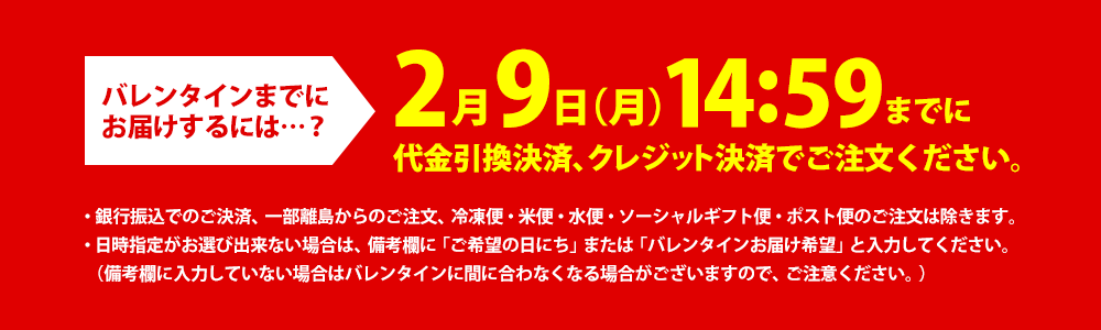 バレンタインまでのお届けは2月9日(月)14:59までに代引き決済、クレジット決済でご注文ください。 詳しくはコチラ
